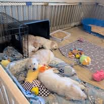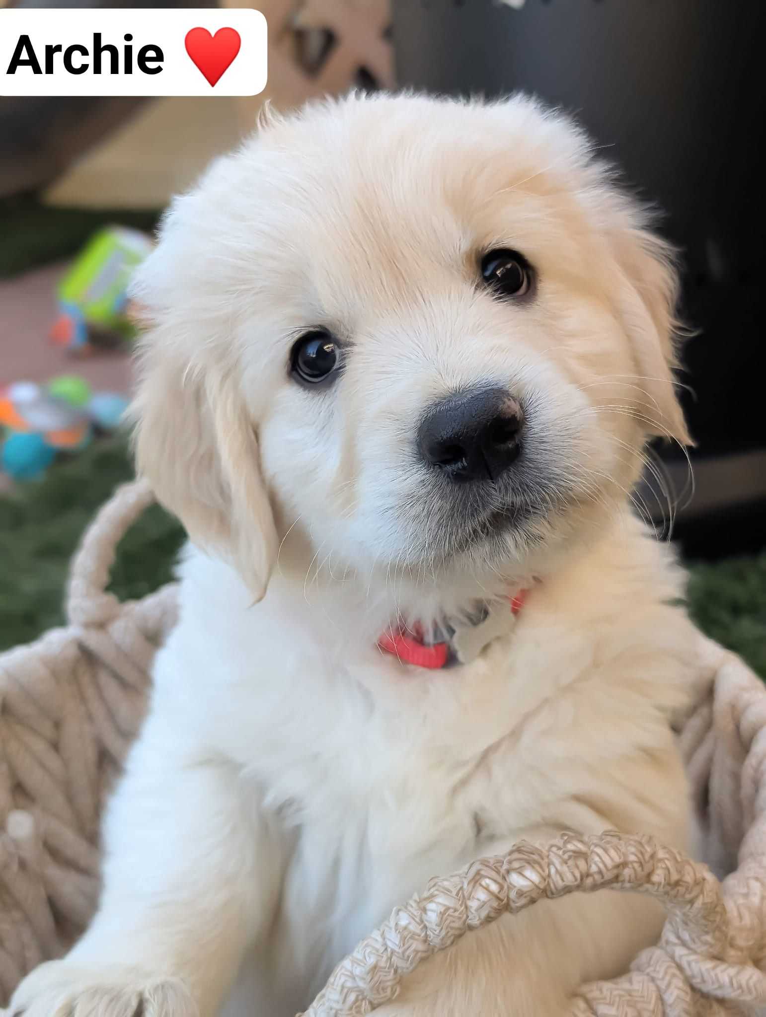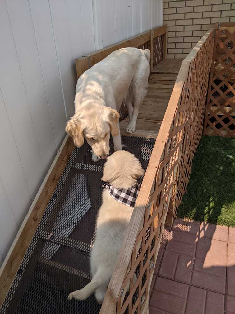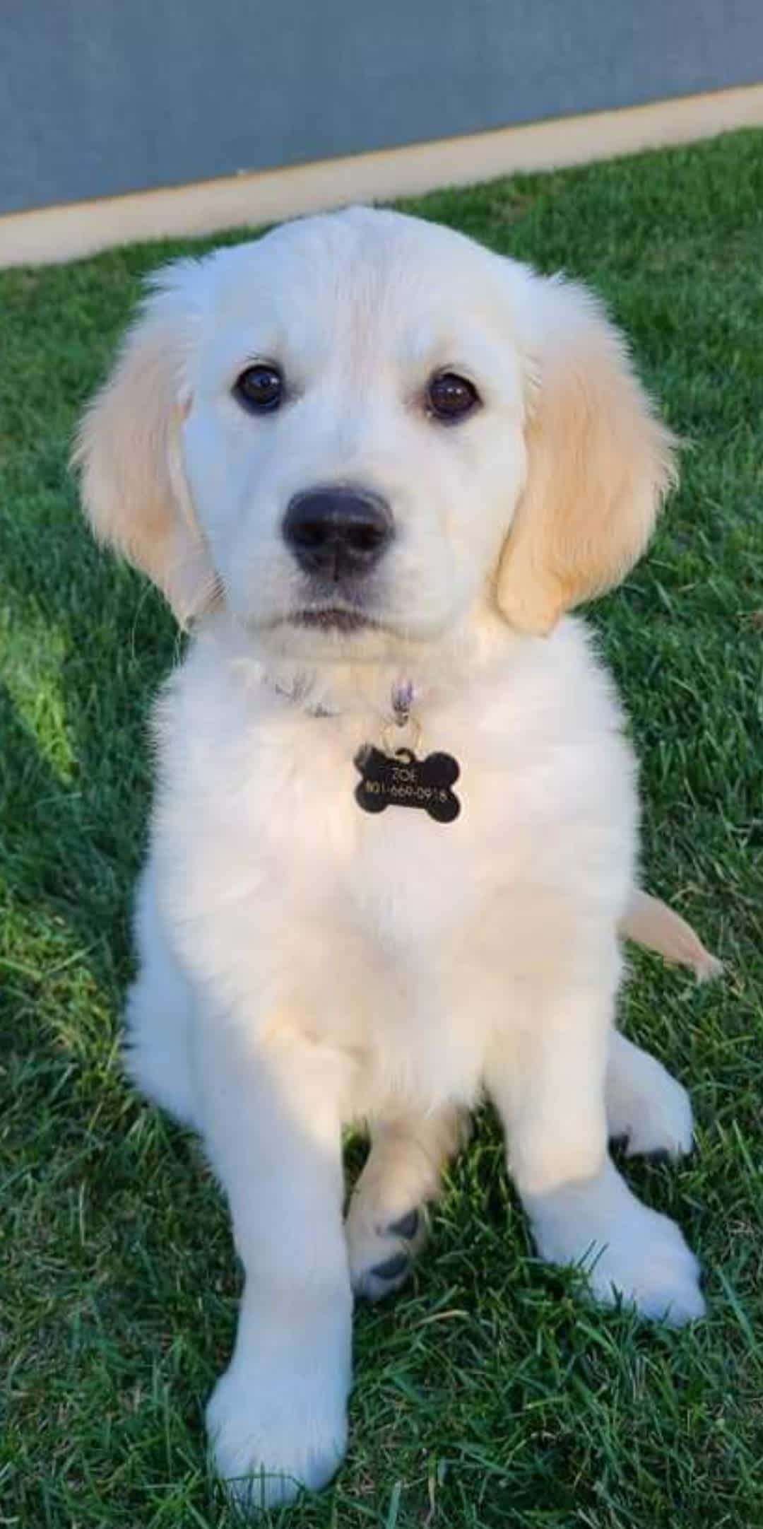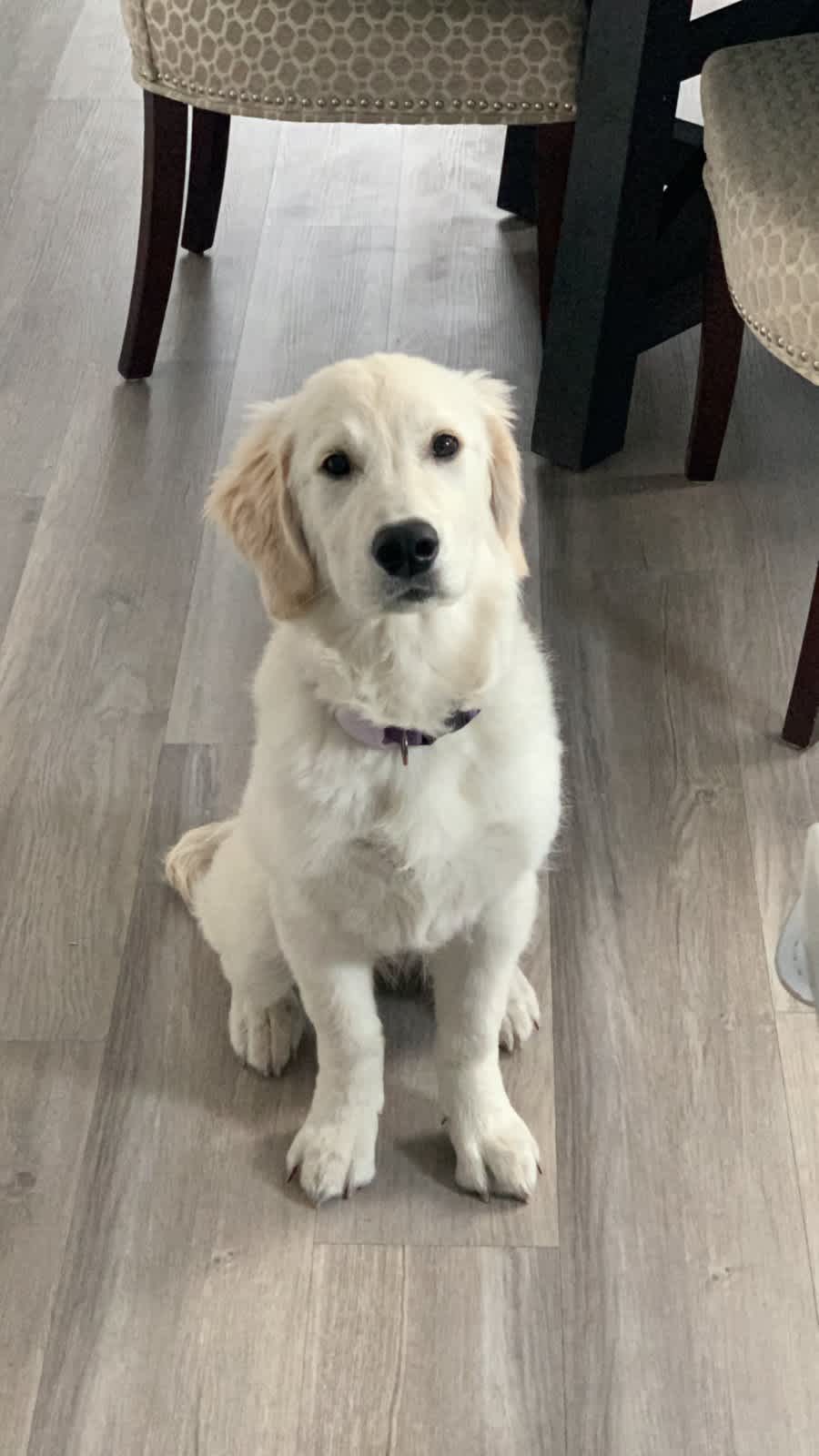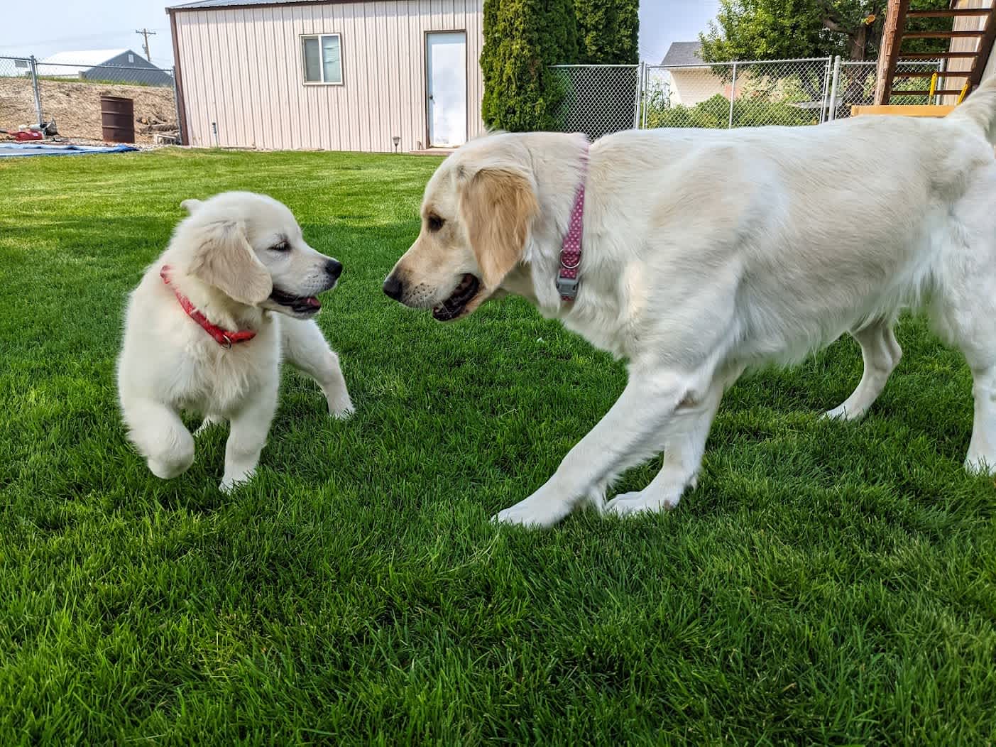 “This is our Bessie (with red bandana) meeting her littermate sister, Carolina from Mountain Sky Golden's (the breeder kept Carolina), for the first time since she was a baby. We are so lucky to have found such a great breeder! We drove over 44 hours total to meet our puppy and pick her up. It was so worth it that we are doing it again to get another puppy from them, which we will be picking up in two weeks. Bessie has the best temperament! She is smart, sweet, and loves all dogs and people. Even though she is only 10 months old, she is always mistaken for an adult because she is so well behaved. She is a natural emotional support animal, she will immediately comfort any one of the family members when she notices they are upset. We plan on getting her certification for being a service dog since she seems to pick up on our autistic daughter's needs so naturally. We believe we couldn't have picked a better breeder! She is also easy to communicate with, flexible, and works with us on our wants and needs with the puppy.” -Amanda H.