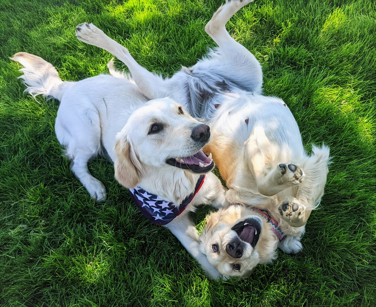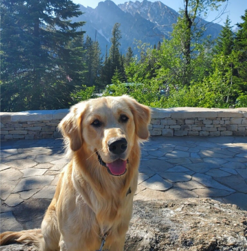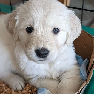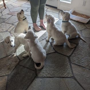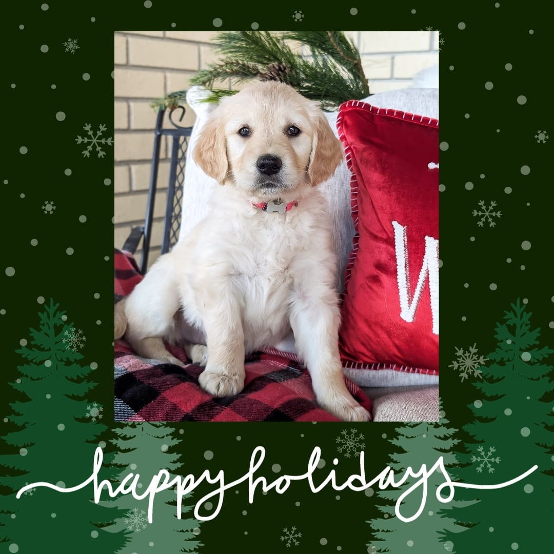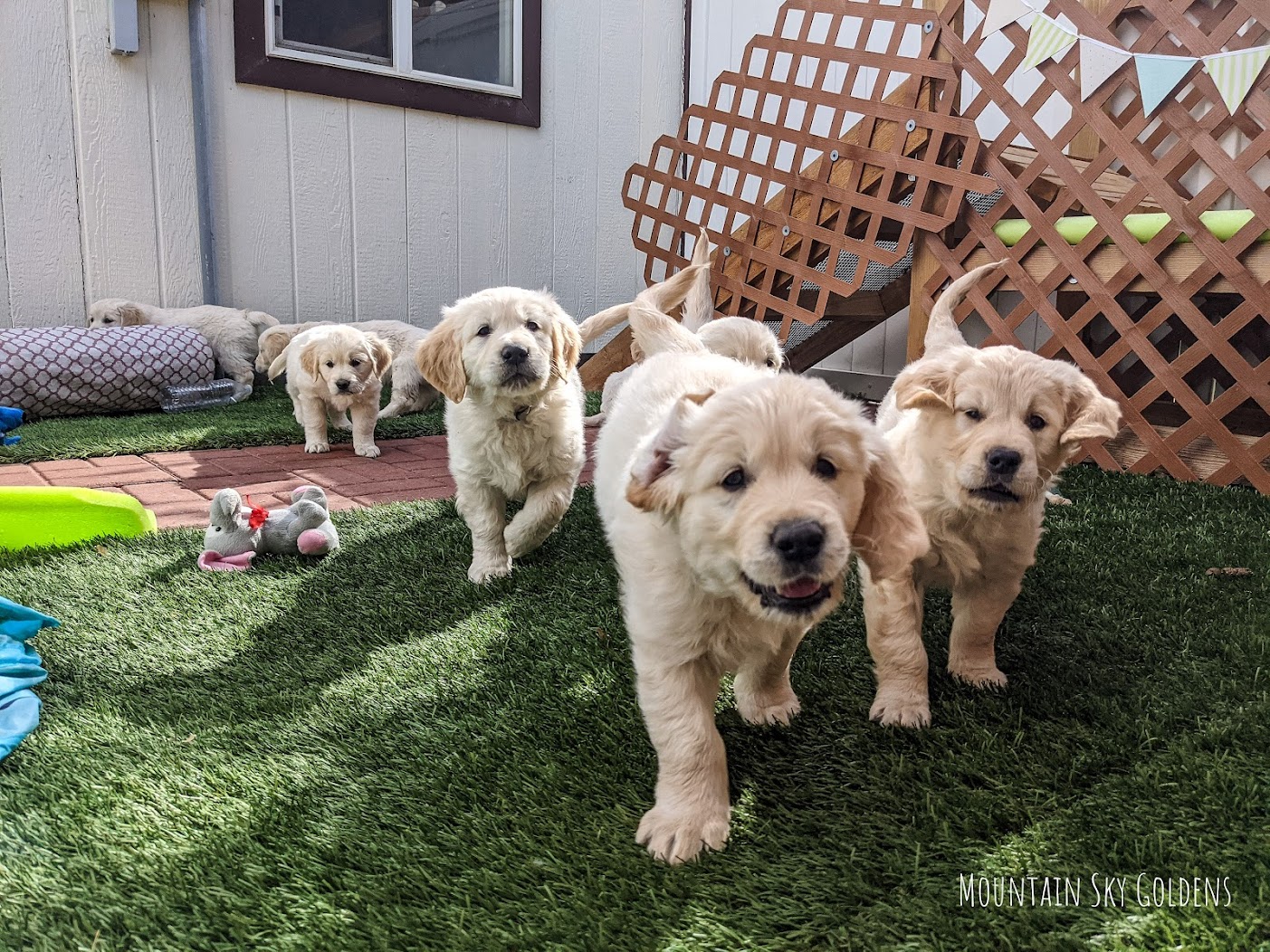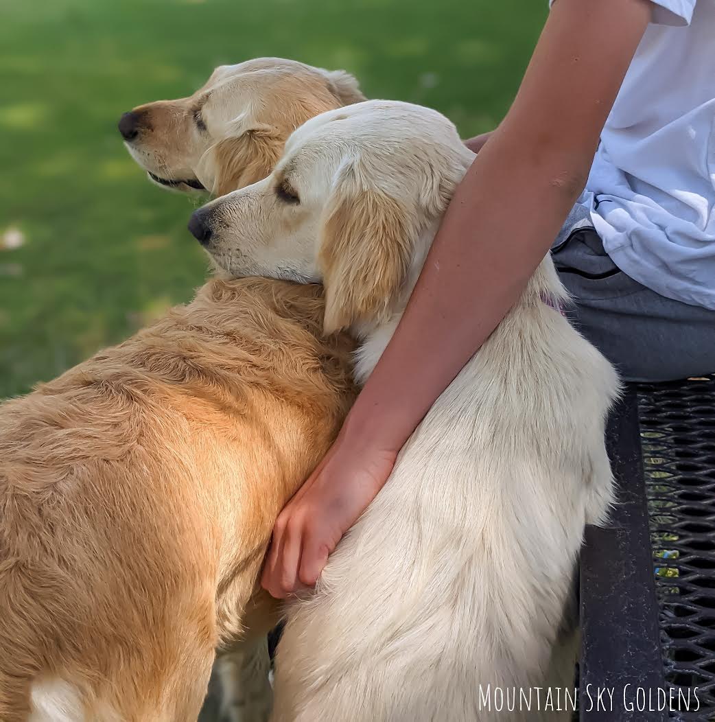 “This is our Bessie (with red bandana) meeting her littermate sister, Carolina from Mountain Sky Golden's (the breeder kept Carolina), for the first time since she was a baby. We are so lucky to have found such a great breeder! We drove over 44 hours total to meet our puppy and pick her up. It was so worth it that we are doing it again to get another puppy from them, which we will be picking up in two weeks. Bessie has the best temperament! She is smart, sweet, and loves all dogs and people. Even though she is only 10 months old, she is always mistaken for an adult because she is so well behaved. She is a natural emotional support animal, she will immediately comfort any one of the family members when she notices they are upset. We plan on getting her certification for being a service dog since she seems to pick up on our autistic daughter's needs so naturally. We believe we couldn't have picked a better breeder! She is also easy to communicate with, flexible, and works with us on our wants and needs with the puppy.” -Amanda H.