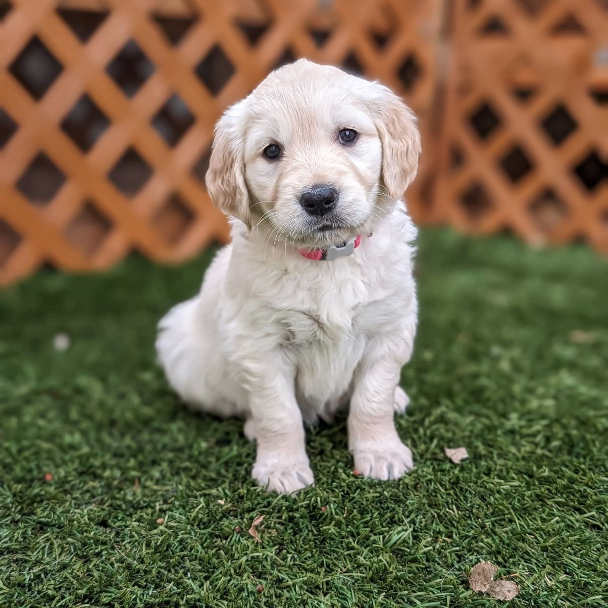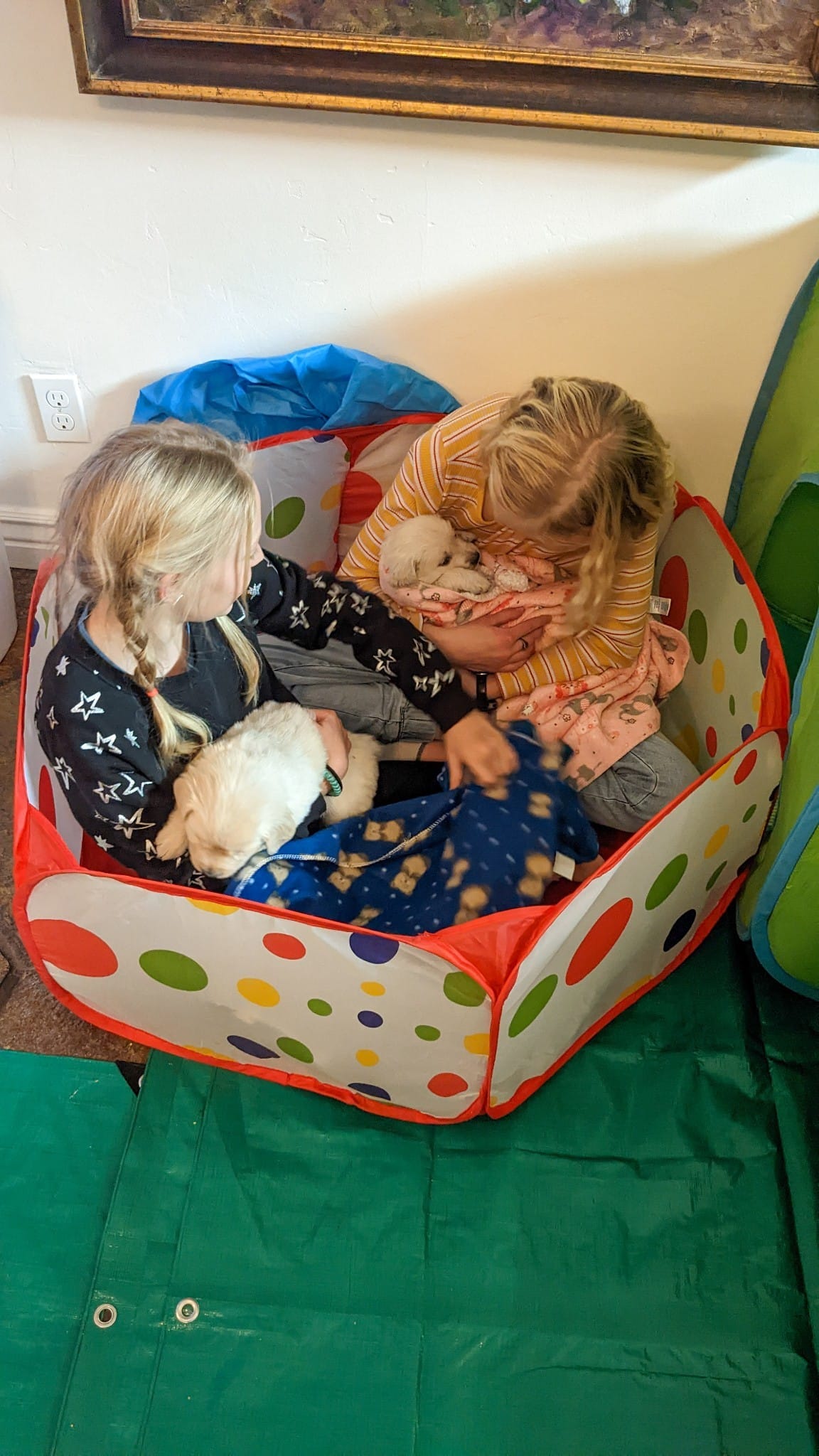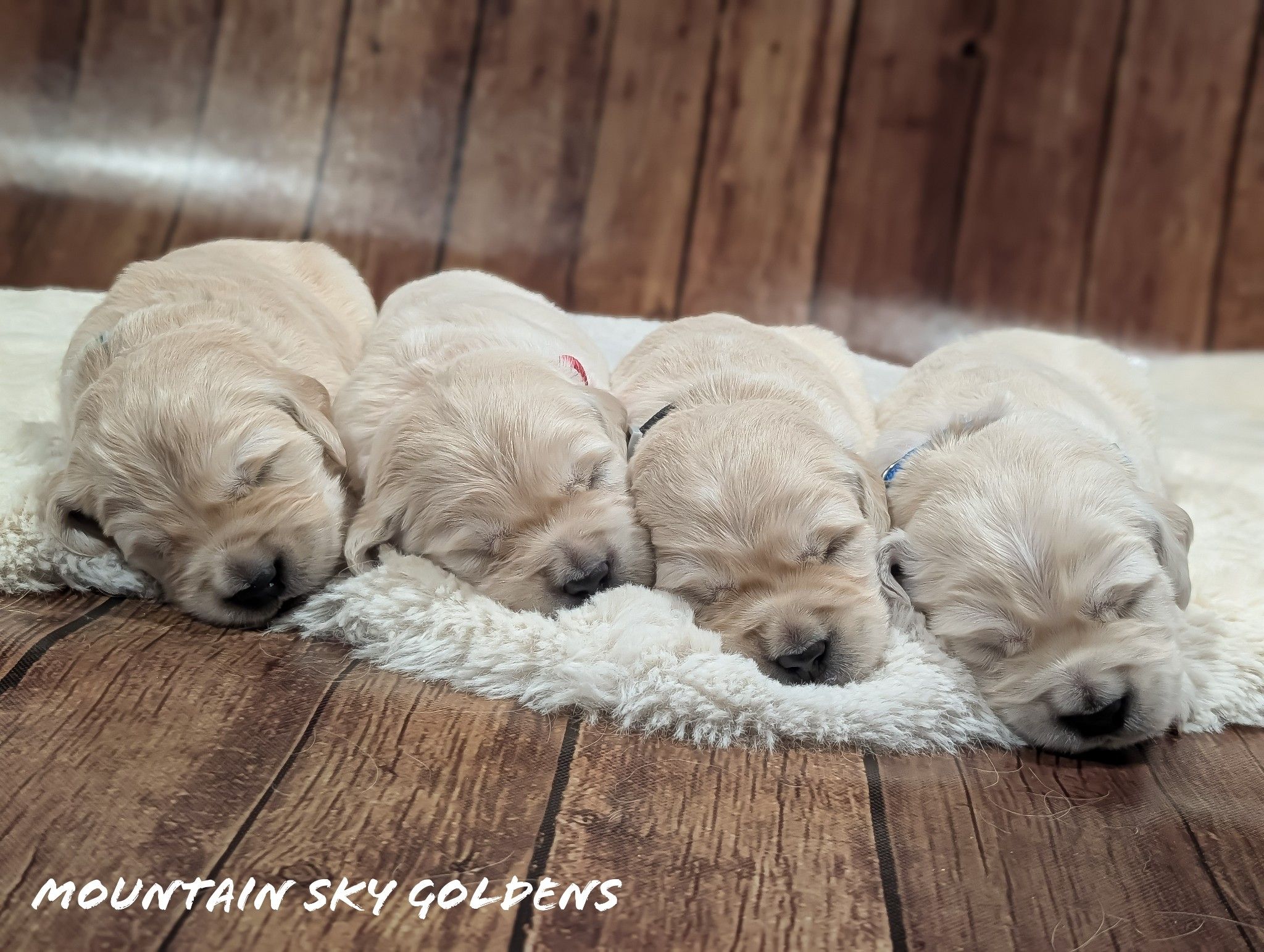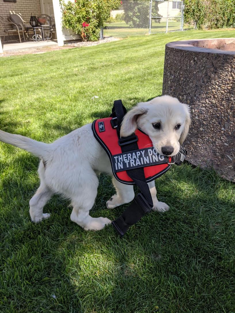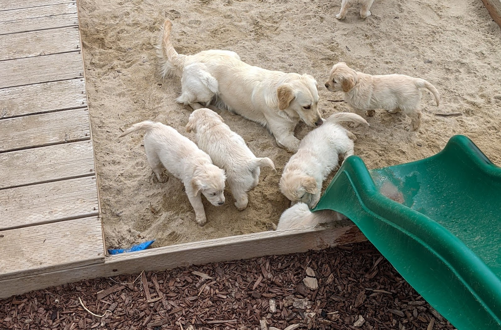 “This is our Bessie (with red bandana) meeting her littermate sister, Carolina from Mountain Sky Golden's (the breeder kept Carolina), for the first time since she was a baby. We are so lucky to have found such a great breeder! We drove over 44 hours total to meet our puppy and pick her up. It was so worth it that we are doing it again to get another puppy from them, which we will be picking up in two weeks. Bessie has the best temperament! She is smart, sweet, and loves all dogs and people. Even though she is only 10 months old, she is always mistaken for an adult because she is so well behaved. She is a natural emotional support animal, she will immediately comfort any one of the family members when she notices they are upset. We plan on getting her certification for being a service dog since she seems to pick up on our autistic daughter's needs so naturally. We believe we couldn't have picked a better breeder! She is also easy to communicate with, flexible, and works with us on our wants and needs with the puppy.” -Amanda H.