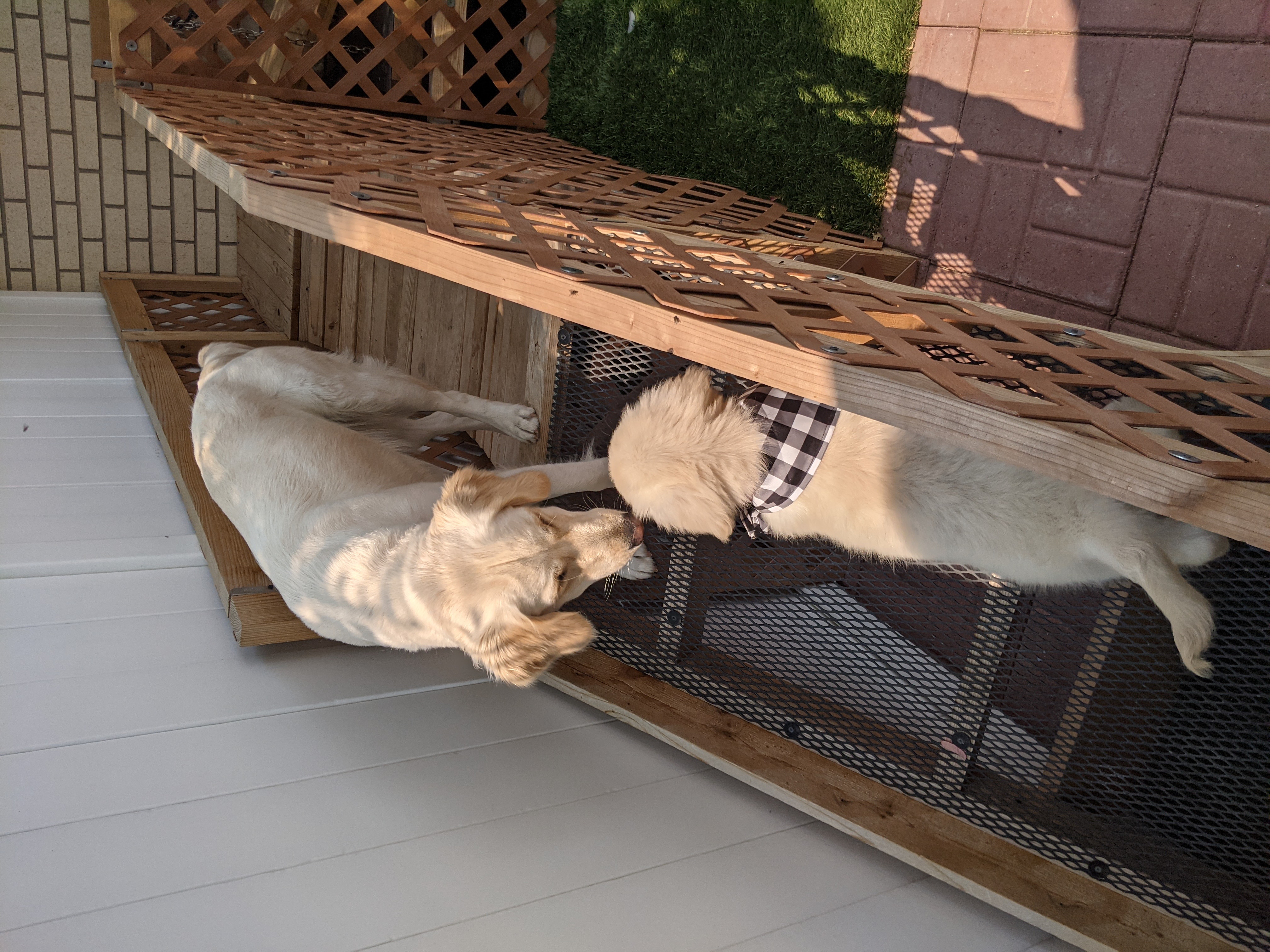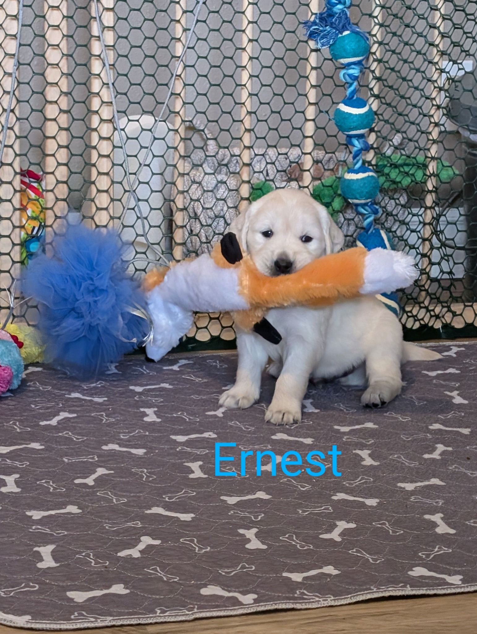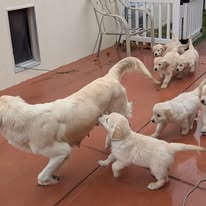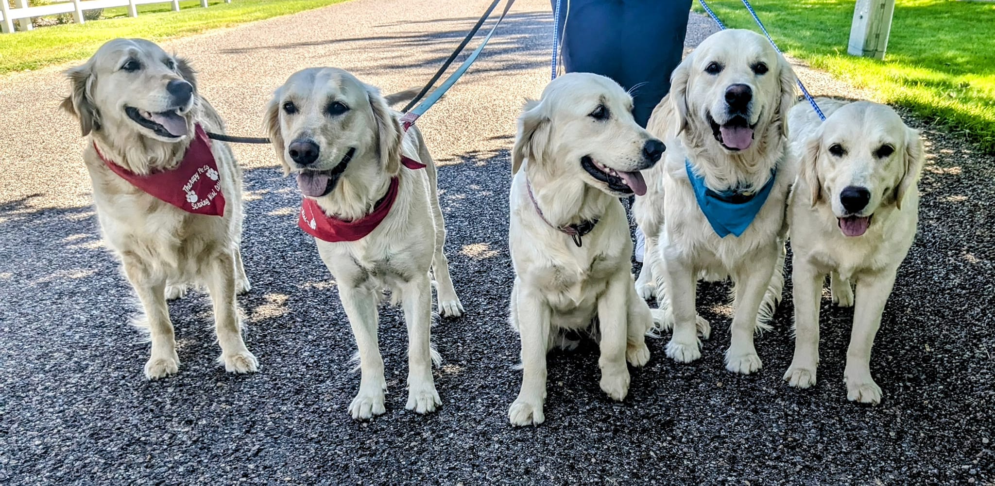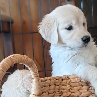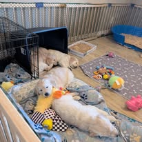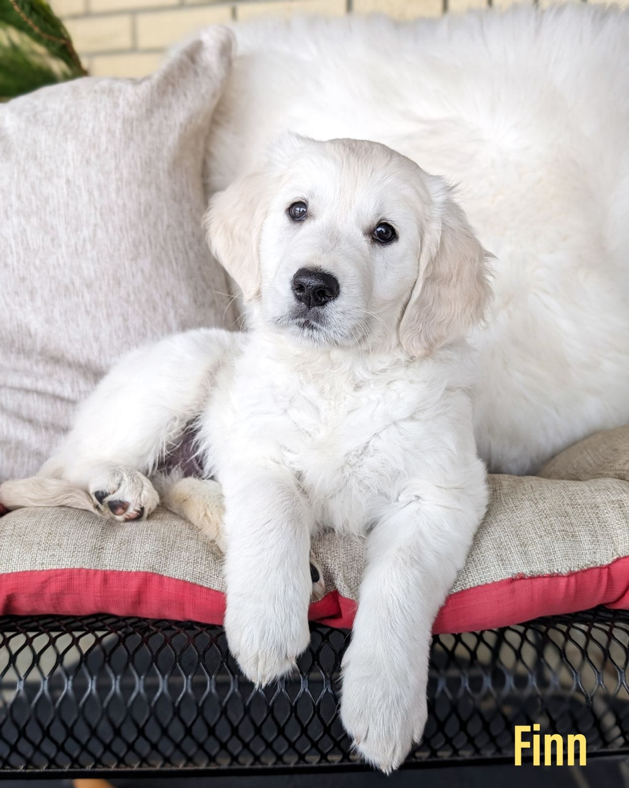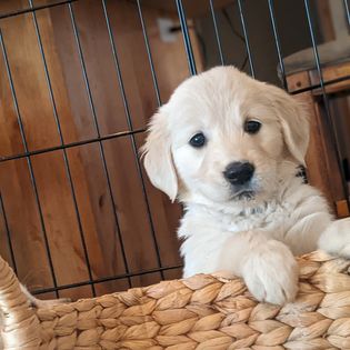 “This is our Bessie (with red bandana) meeting her littermate sister, Carolina from Mountain Sky Golden's (the breeder kept Carolina), for the first time since she was a baby. We are so lucky to have found such a great breeder! We drove over 44 hours total to meet our puppy and pick her up. It was so worth it that we are doing it again to get another puppy from them, which we will be picking up in two weeks. Bessie has the best temperament! She is smart, sweet, and loves all dogs and people. Even though she is only 10 months old, she is always mistaken for an adult because she is so well behaved. She is a natural emotional support animal, she will immediately comfort any one of the family members when she notices they are upset. We plan on getting her certification for being a service dog since she seems to pick up on our autistic daughter's needs so naturally. We believe we couldn't have picked a better breeder! She is also easy to communicate with, flexible, and works with us on our wants and needs with the puppy.” -Amanda H.