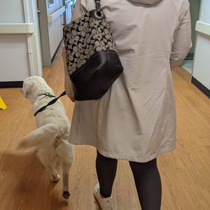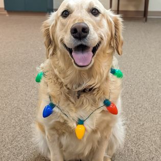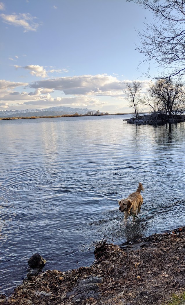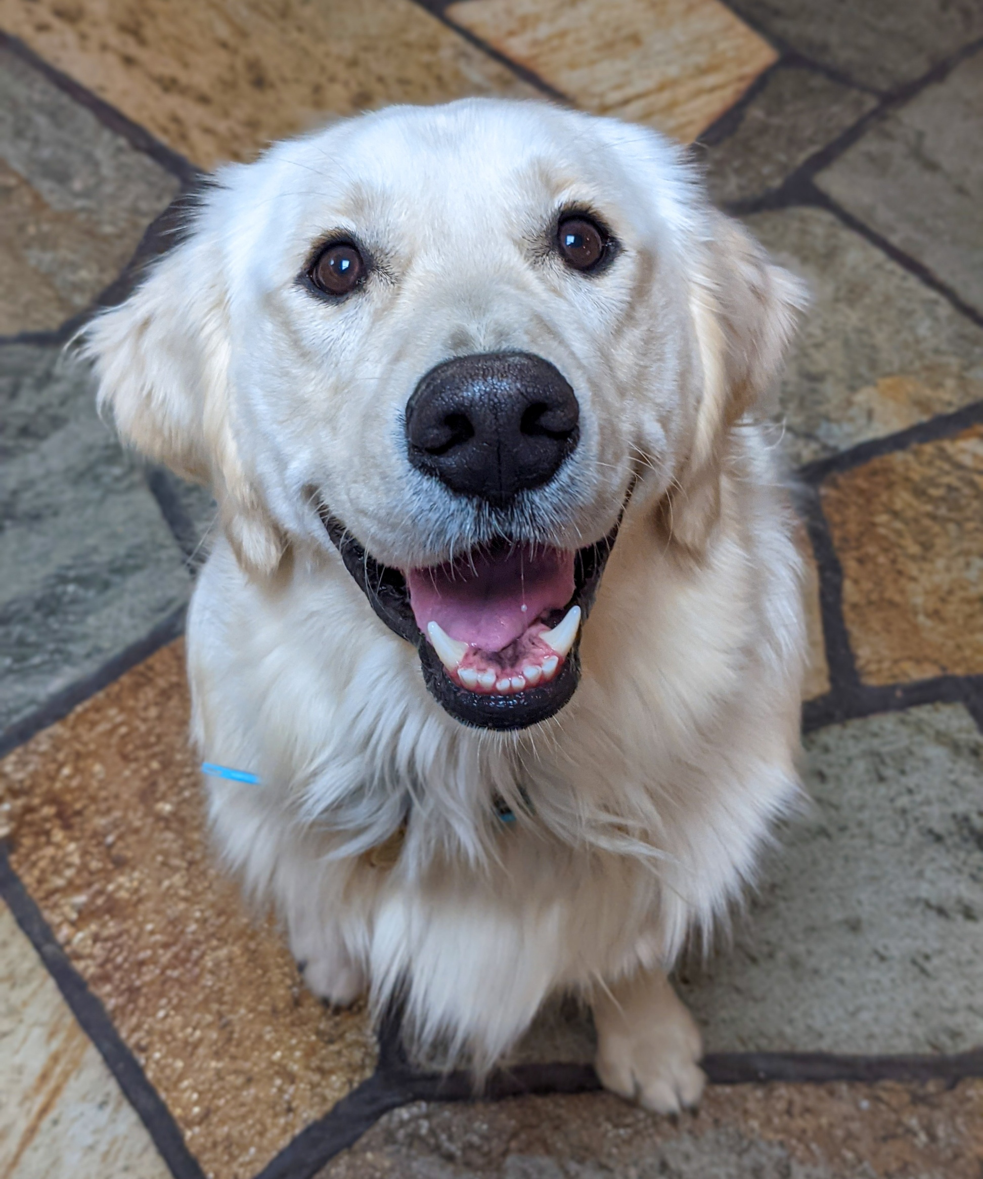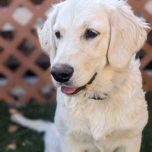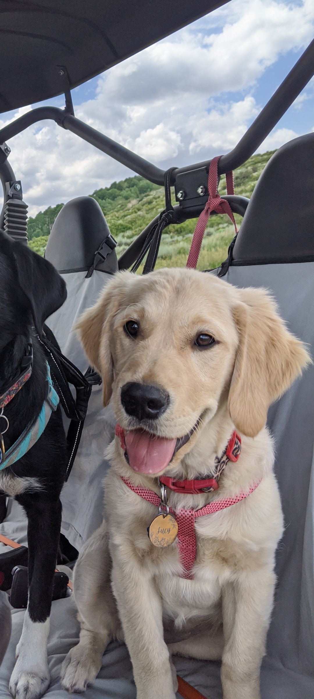 “ Lucy is doing great!. She is super gentle with people and really great with other dogs. She is super cuddly and loving. When you sit down she either puts her head on our lap or wants you to hold her paw. She is also pretty goofy and gets distracted by watching tv, shadows and chasing bugs in the backyard. She loves food and spins in circles when we get her food ready. We have gone camping a few times and she adapts really well to new situations.”